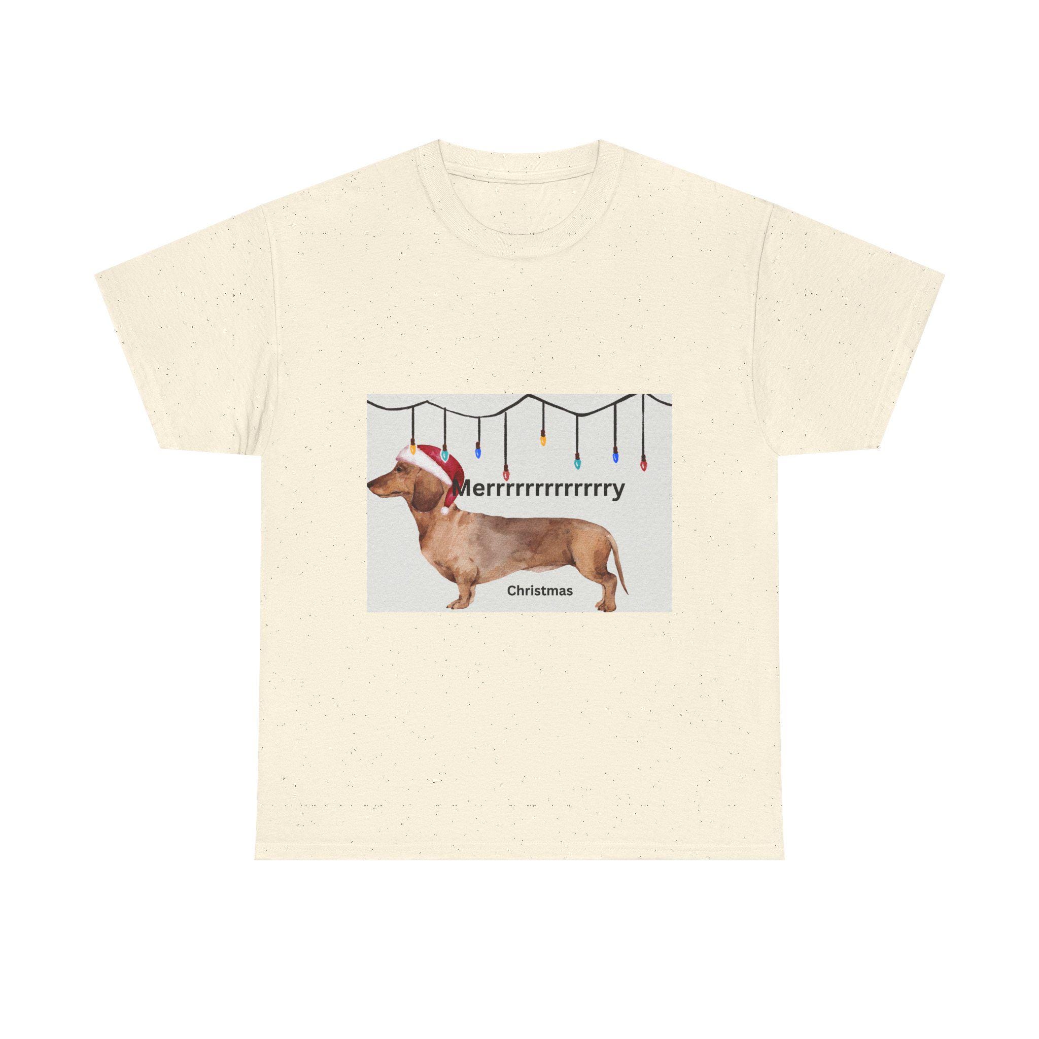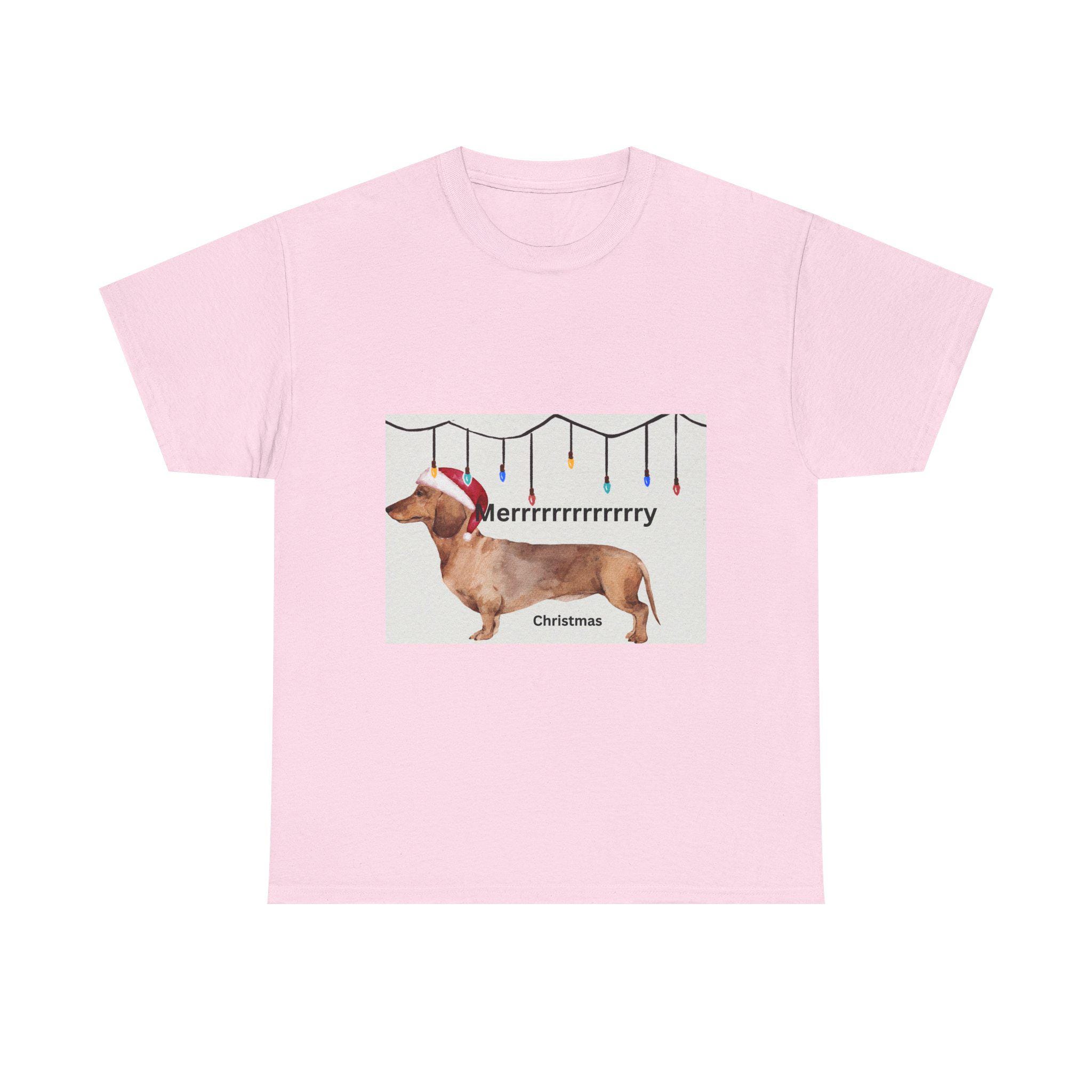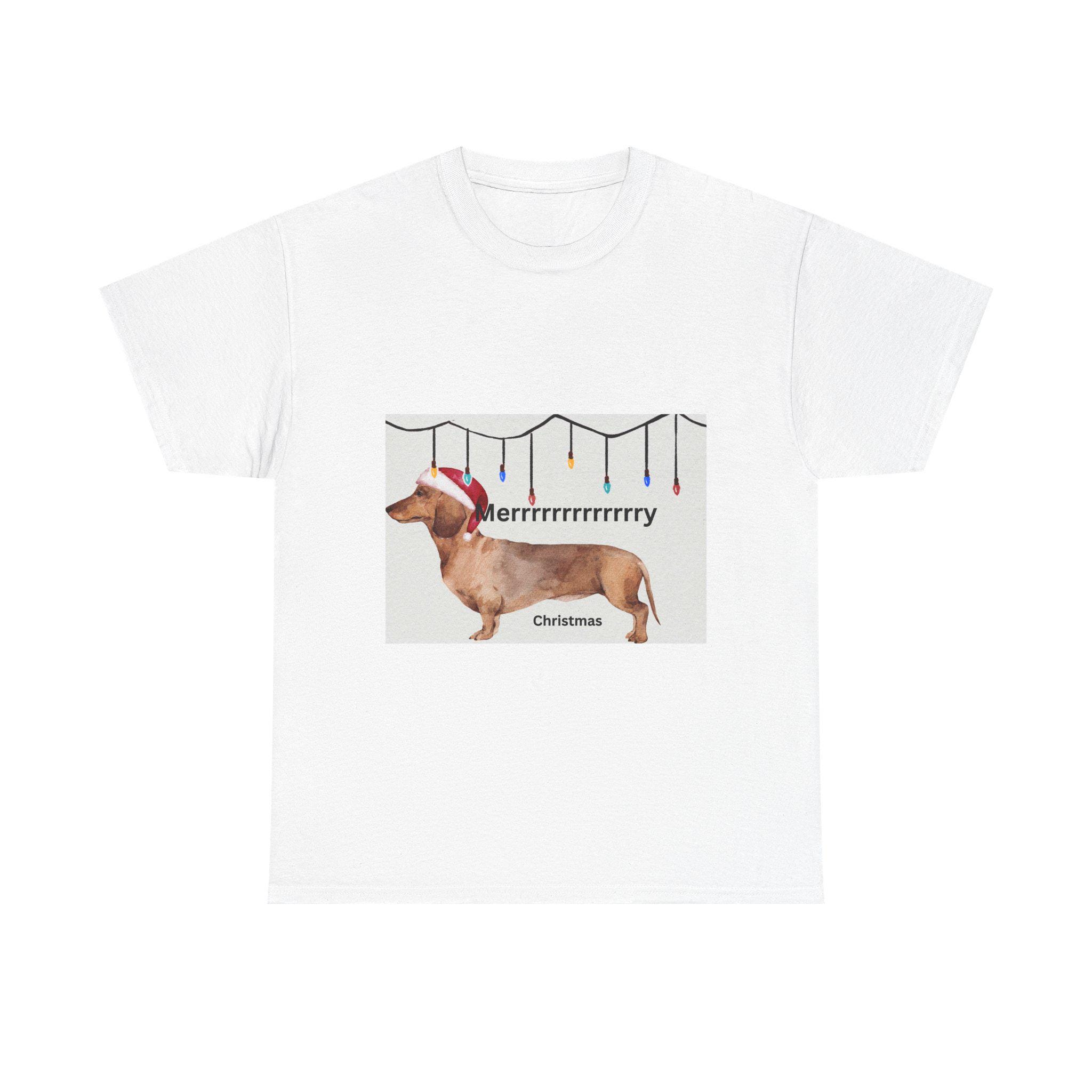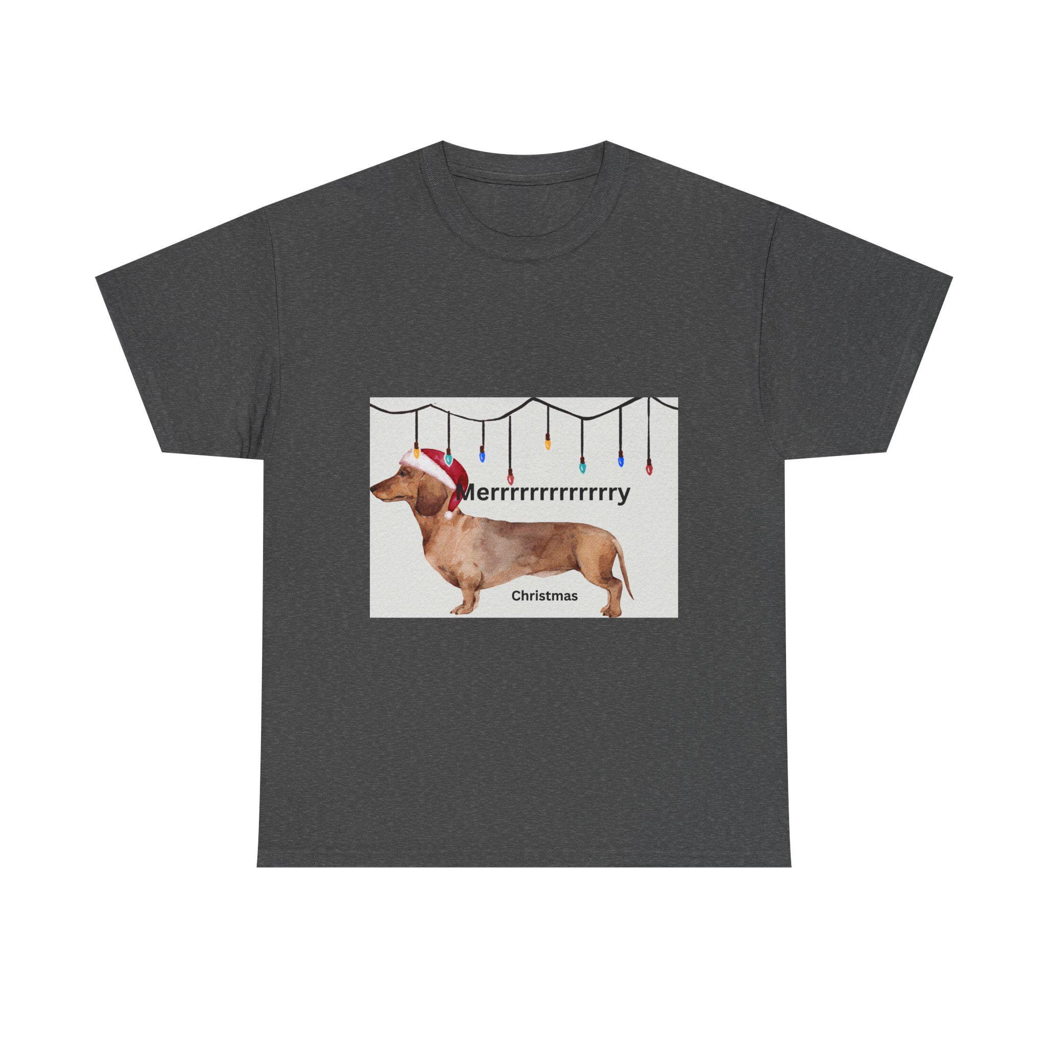 Soft, comfy, and quietly playful — this classic crew tee brings a cozy holiday wink to anyone who loves small-dog energy and low-key seasonal humor. A dachshund in a Santa hat stands beneath a string of warm lights with a stretched-out “Merrrrrrrrrry” that makes you smile without shouting. The medium-weight cotton holds print detail well, the crew neckline and classic fit drape easily over layered sweaters or lounge pants, and the tear-away label keeps things itch-free. Wear it to casual family dinners, neighborhood cookie swaps, or slow mornings unwrapping presents — it reads like an inside joke for people who prefer warm socks, hot cocoa, and good company.