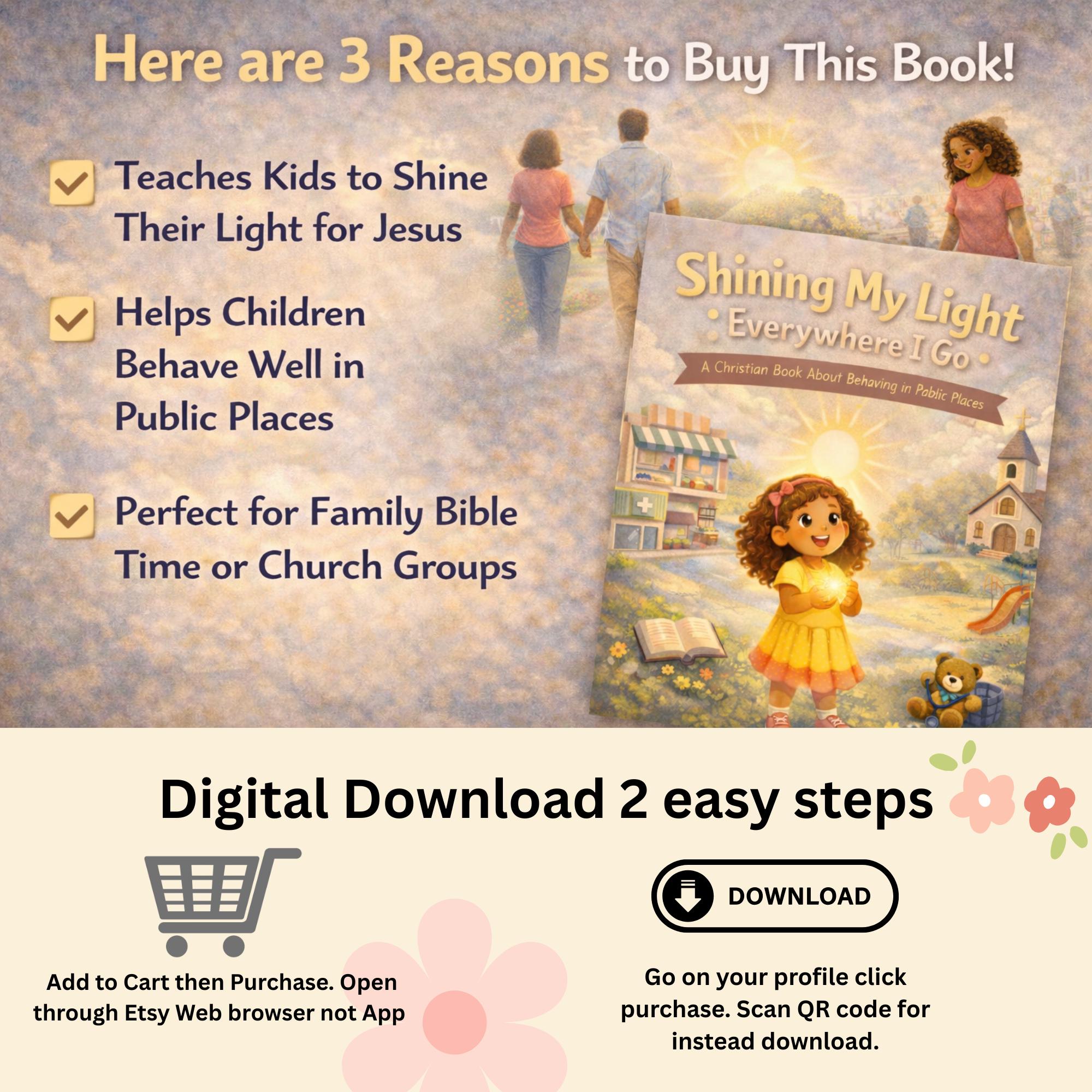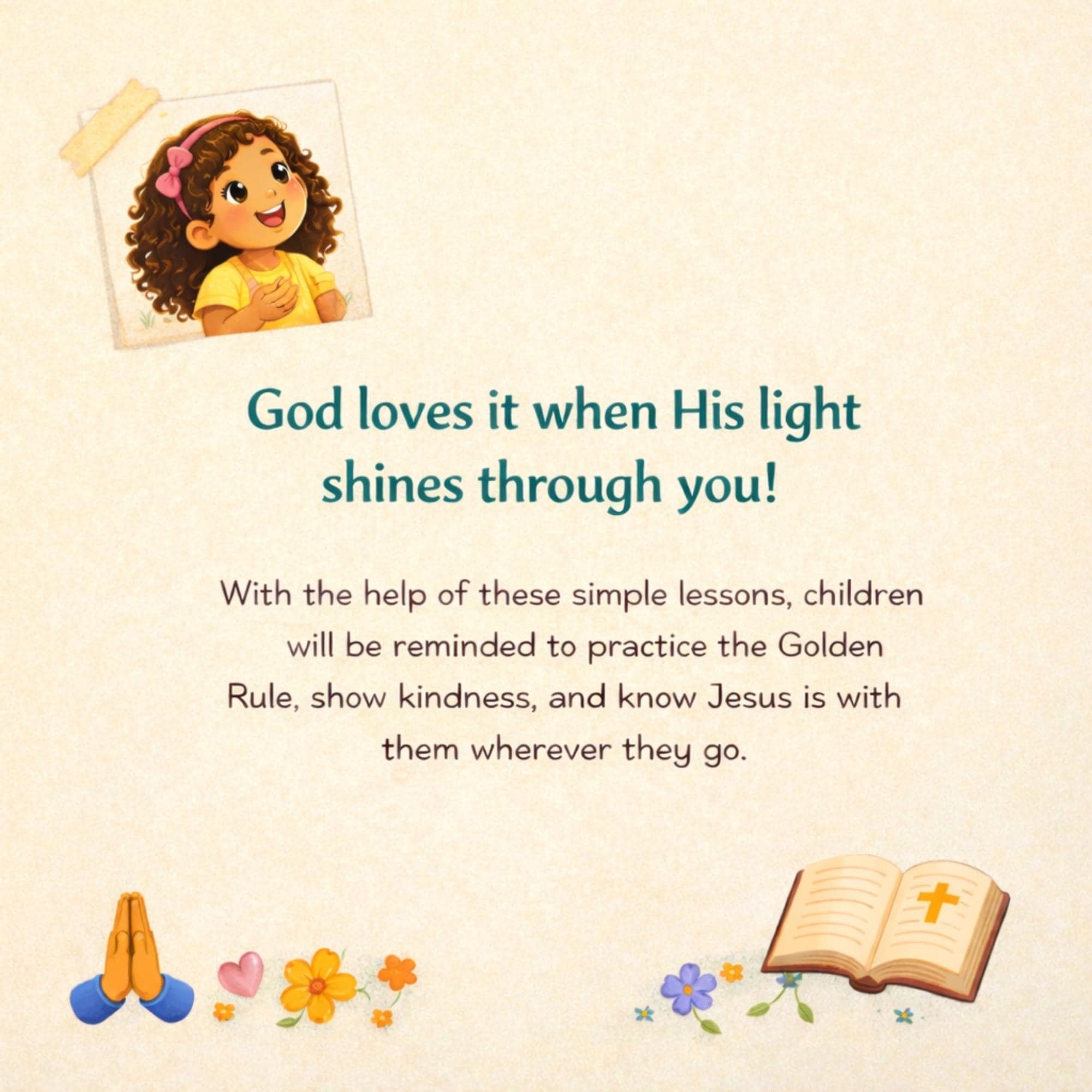Through beautiful illustrations and simple messages, children learn that even small actions—like listening, being kind, and staying close to their parents—can be ways to shine their light for Jesus.